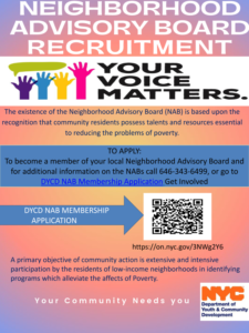 Department of Youth and Community Development is conducting a citywide Community Needs Assessment (CNA) to collect feedback from New Yorkers to set program priorities and direct resources where they are needed most. We want to help ensure local services reflect real community needs. Completing the survey affords residents a chance to shape the future of their neighborhoods.