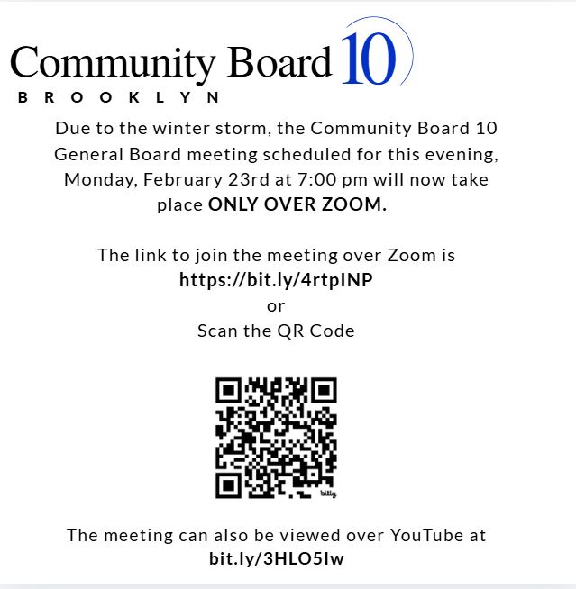 Note: CB 10 Board meeting Monday, February 23rd will be over Zoom Only!